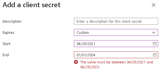 3. Enter a brief description of the secret and define a validity period that includes a start date and end date: