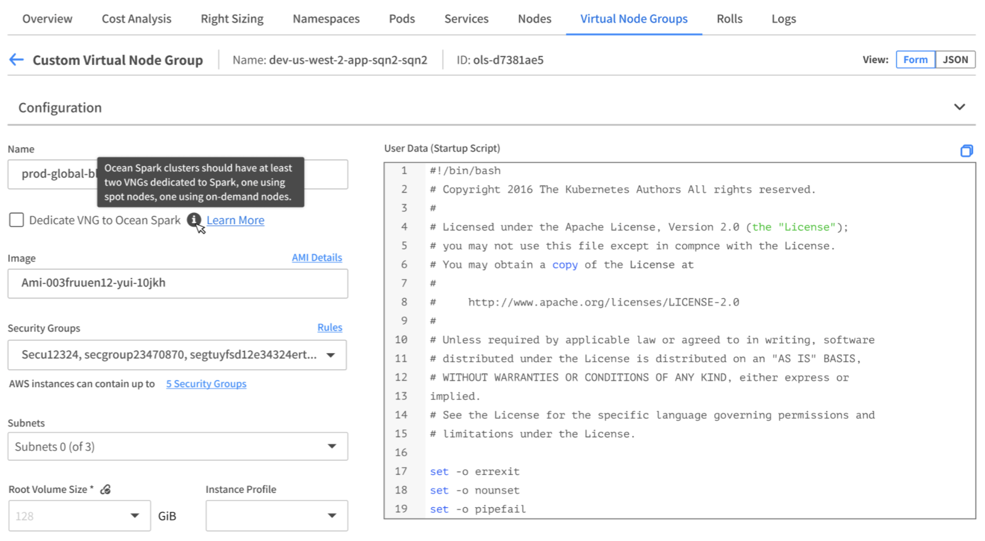 Additional VNGs can be created in the console, using Terraform, or using the Spot API. In the console, a checkbox shown in the example below gives you the option to dedicate a VNG to Ocean Spark.