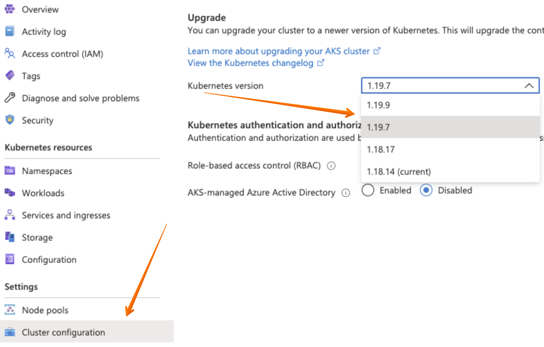 Under “Cluster configuration” in your AKS console, define the Kubernetes version you want to upgrade to and click Save.